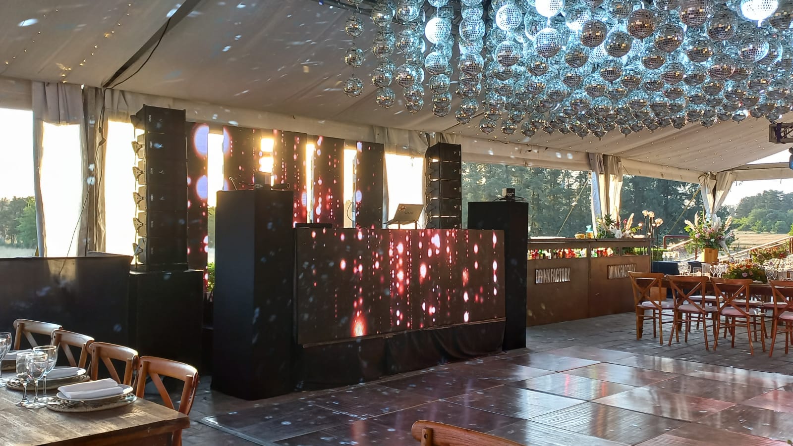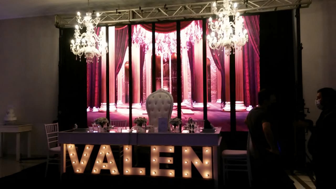Cabinas de dj, pantallas de led con apertura para el ingreso de la homenajeada/o, totems de leds, diseños especiales.